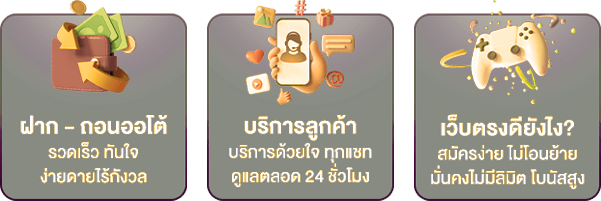 ตอบ : - ฝาก-ถอนอัตโนมัติตลอด 24 ชั่วโมง - ไม่มีขั้นต่ำในการฝาก - ถอนขั้นต่ำเพียง 100 บาท - ทำรายการเสร็จภายใน 30 วินาที